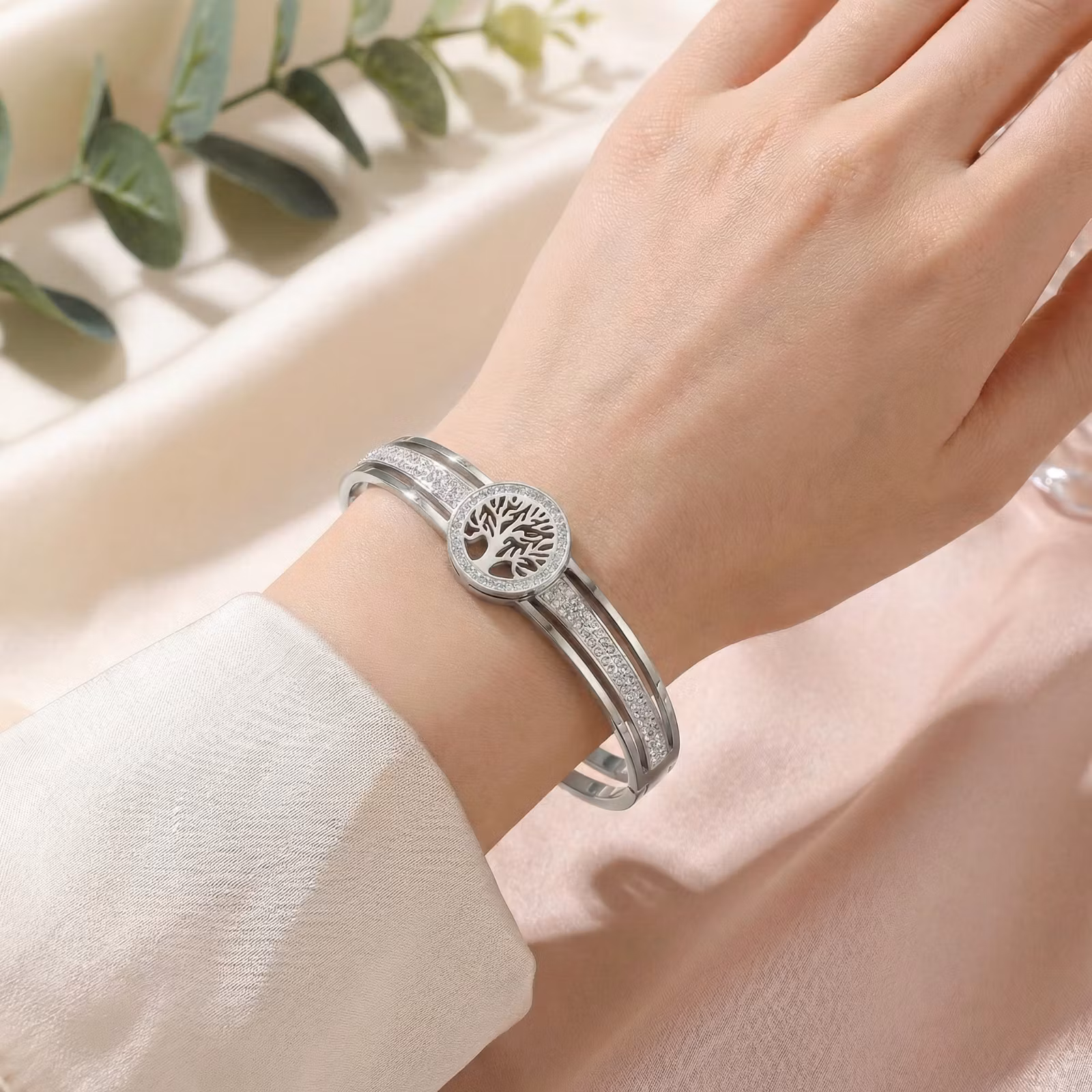 Ett stilrent och symboliskt armband med Livets Träd, en tidlös symbol för styrka, balans och samhörighet. Armbandet är tillverkat i rostfritt stål och vackert pläterat för en exklusiv silverfärgad finish. De gnistrande kristallerna ger en elegant touch som passar lika bra till vardag som till fest.